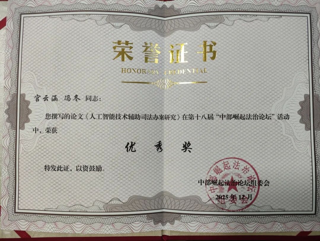 近日,第十八届“中部崛起法治论坛”获奖论文评选结果揭晓。本院报送的论文《人工智能技术辅助司法办案研究》荣获优秀奖。